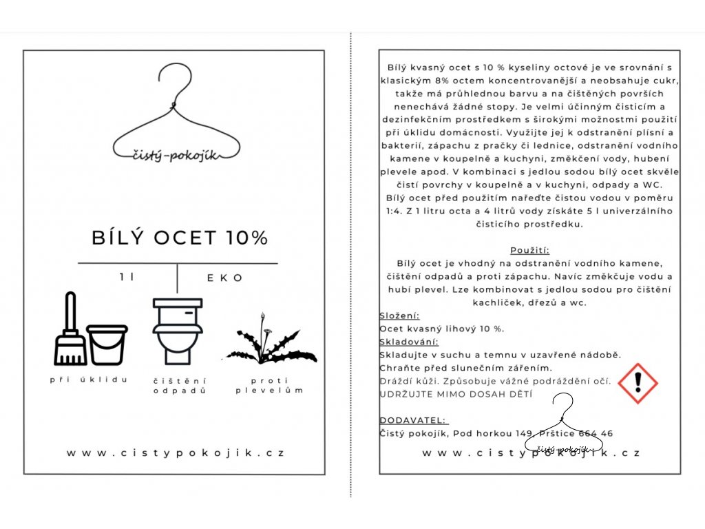 Bílý kvasný ocet s 10 % kyseliny octové je ve srovnání s klasickým 8% octem koncentrovanější a neobsahuje cukr, takže má průhlednou barvu a na čištěných površích nenechává žádné stopy.
